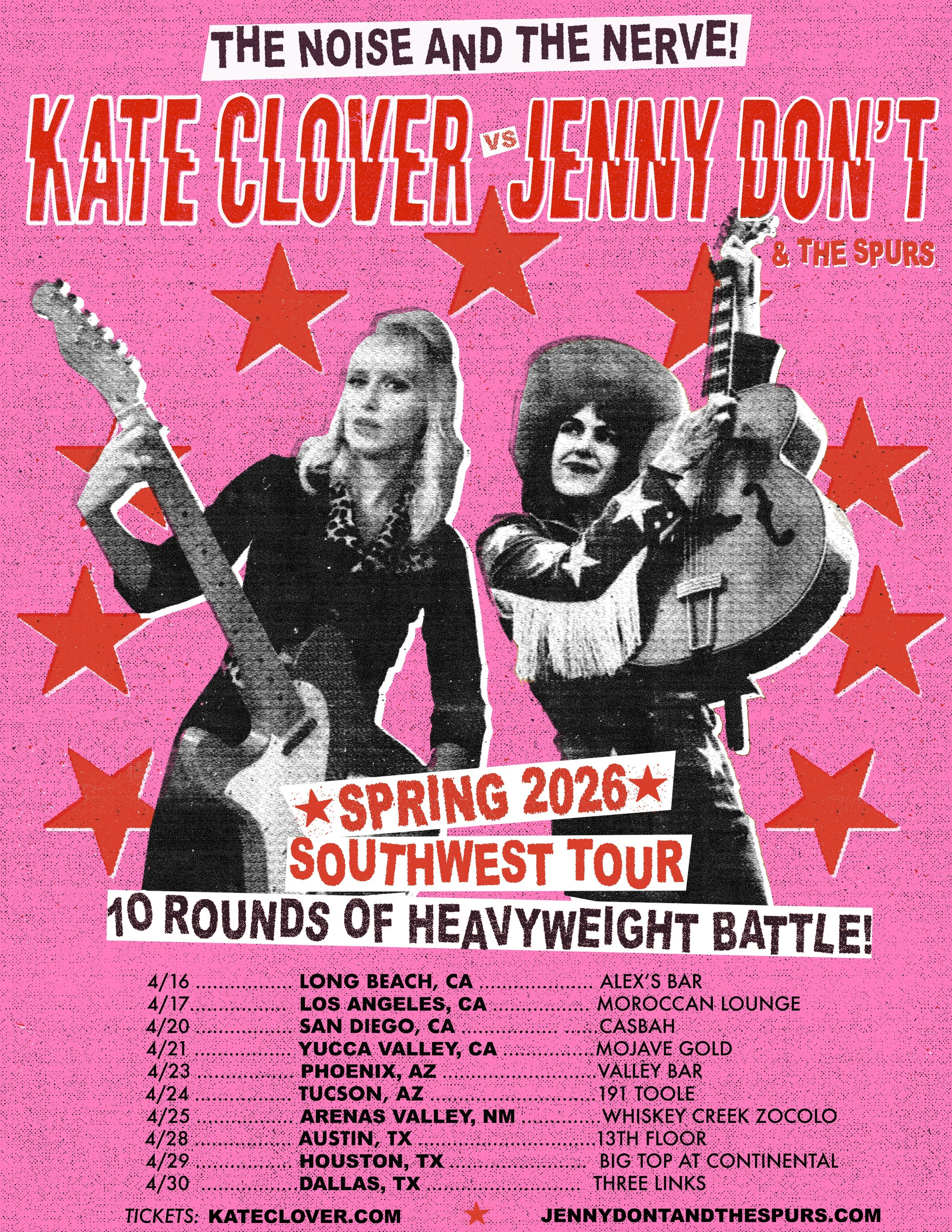 THE NOISE AND THE NERVE! Kate Clover vs Jenny Don’t & The Spurs, Spring Southwest tour. The most explosive rock-tastic package in closed circuit history! Witness the spectacle of 10 rounds of Heavyweight battle! Punks vs Cowboys, the never-ending saga brought to you in real time. Get a front row seat to witness history! Tickets on sale now!